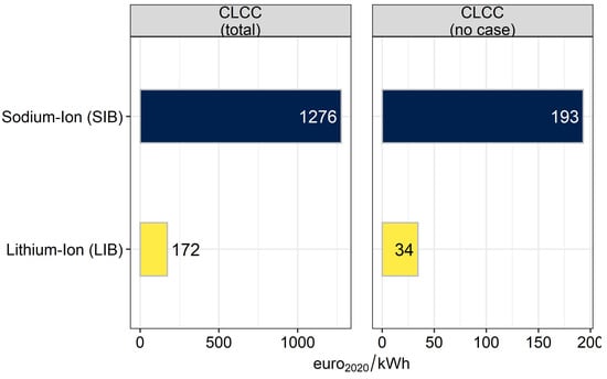 The SIB is characterized by a value of the C-LCC indicator that is more than seven times bigger than LIBs. This means that, even under the hypothesis that SIBs can be already produced at an industrial scale, its resource consumption is much larger than that of LIBs. Even when the battery case is not considered (which, being made from metal represents a significant share of the total C-LCC value), the picture does not change much, as Figure 8 suggests.