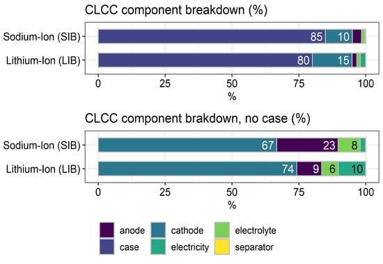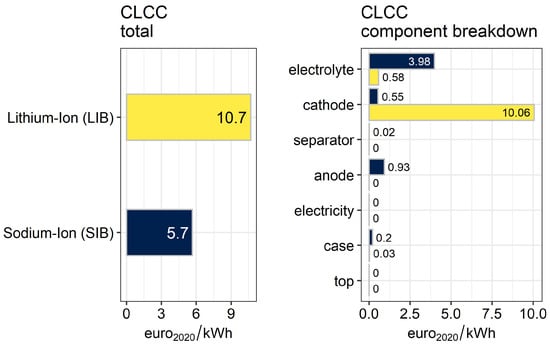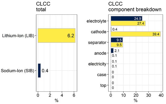 Apart from this case, the cathode is the component that weights the most on the total C-LCC indicator, for both batteries considered. The anode is more than two times more important for SIBs than for LIBs, which, on the contrary, are characterized by a much greater weight of electricity consumption.
