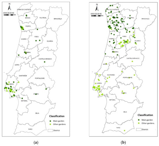 The historian Sousa Viterbo [36,38] produced a first work, A Jardinagem em Portugal (Gardening in Portugal) (1, Table 2), in which he expresses concern about the serious threat that gardens might disappear because they are not studied, registered or protected by specific legislation. The two editions of the work do not have the rigid and systematic character of an inventory; they mainly focus on gardening techniques and the gardeners. However, the author does list a series of remarkable gardens, mostly quintas de recreio, describing about 50 units in some detail, especially at the historical level. He refers to many others, mainly located in the large urban centers of Lisbon, Porto and surrounding areas (Figure 1a).