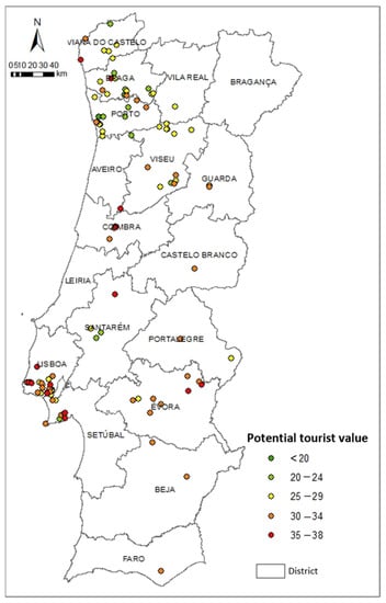 At the end of the 1990s, a team of landscape architects were commissioned by the Institute of Financing and Support to Tourism to carry out a survey of the historical gardens in mainland Portugal, taking into account their tourist potential (7, Table 2). The work was developed in three phases: an initial list was drawn up using previous surveys and other documentary sources; these places were visited to collect information and a photographic record was made; in the third phase, a study was carried out to provide an overview that included the quantification of its potential for tourism. About 120 gardens were identified and each was assigned its own value based on the intrinsic qualities and the items/features of a Portuguese garden (construction time, creator/historical features, landscape features, built elements, vegetation, bibliographic and/or pictorial references and legal classification) and a complementary value, including potentially developing tourism and promoting qualities outside the gardens (location, surroundings, activities carried out, need for restoration and owner inclination) [41]. The potential tourist value, rated between 1 and 40 points, varied between a minimum of 12 and a maximum of 38. The Lisbon and Porto regions account for a large proportion of the gardens with tourist potential (40%), followed by the central region (Figure 2).