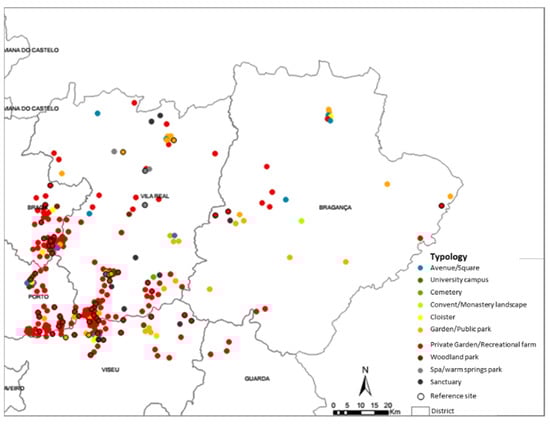 During the course of the new millennium, the inventory Arte Paisagista no Norte de Portugal (Landscape Art in Northern Portugal) was a project carried out by the Department of Landscape Architecture of the University of Trás-os-Montes and Alto Douro (UTAD) (8, Table 2). It covered 36 municipalities in the north-east of Portugal. The methodology adopted included gathering and analyzing several documentary sources of inventory methodologies and gardens, and direct contacts with various public bodies, owners and managers of the places. A list of more than 780 sites of potential landscape interest was produced and this made it possible to start building a digital database and documental archive. The places were visited to collect information and images, resulting in a final selection of 274 sites. The selection criteria were: aesthetic quality; the quality of the construction and decorative elements and the botanical collection; mention of an artistic period or a recognized designer; an association with a historical event or period of special interest; the degree of influence of the site on its cultural and social context; integration and the relationship with the surrounding landscape; and the degree of integrity and conservation status of the site [42]. Private gardens and quintas de recreio (70.1%) were the most prevalent category. About three-quarters of the properties were privately owned and were concentrated in a specific type of area (river valleys) (Figure 3).