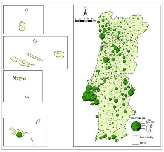 With the reorganization of the Green Space category, sub-categories were created—a set of green spaces, spaces for walking around, for growing plants, for playing sport, gardens (more than three-quarters of the inventoried spaces) and parks, in which other more specific typologies were defined by type and function. There is no category of historic garden, and the nature of the information, often flawed and with little detail, makes it hard to accurately individualize the historic gardens. Having adopted this new approach, although the asymmetries and main foci of attention have not changed, most of the quintas de recreio, convent and monastery landscapes, manor houses, and so forth, are no longer included and are in the category ‘Architectural Complex’. A significant number of Portuguese historic gardens are thus excluded, up to now [45]. This exclusion may not be definitive, because, as in other cases, the gardens of these groups should have their own specific entry and be included in the Green Space category.