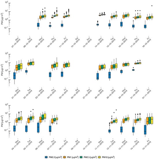 For the continuous measurement of airborne particles, we used the portable GRIMM Aerosol Spectrometer and Dust Monitor (GRIMM Aerosol Technik, Ainring, Germany) Model 1.109, which is considered a research-grade device of moderate cost [30,31,32]. The measuring principle of this model is based on light scattering off single particles with a semiconductor laser as a light source. Model 1.109 possesses 31 size channels for measuring particle size distribution within the range of 0.25 to 20 µm, recorded every 5 min (with a time resolution of 6 s). For each size fraction, the mass concentration is estimated. For these reasons, GRIMM Model 1.109 is considered suitable for aerosol research and the compilation of occupational health data [30,31,32]. As GRIMM results are not in compliance with European standards for PM10 and PM2.5, we complemented their measurement by standard gravimetric analysis (EN 12341). For this, the sampling train was equipped with a filter (PTFE Membrane Filters (37 mm), Sigma-Aldrich, Molsheim, France) in a cassette holder (Personal Impactor H-PEM, BGI, USA) connected to a cyclone and attached with flexible tubing to a pump (GilAir Plus, Sensidyne, Germany) operating at 4 L/min. Moreover, we used the particle counter “DiSCmini” (Testo, Monchaltorf, Suisse) to measure particles from 10 to 700 nm, yielding particle number concentration (#/cm3) and lung-deposited specific area (LDSA) (recorded every 6 s; time resolution of 1 s). In addition to instrumental PM measurements, technicians documented every participant’s location and event that occurred during his/her work shift in a standardized activity logbook.