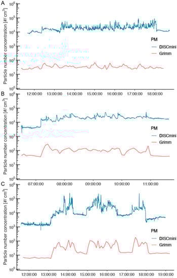 As illustrated in Figure 5, using the measurements corresponding to the mid-point days in the PM monitoring interval, the two devices reflect relatively similar patterns in concentration changes over time. Although the latter records more peaks, probably due to a better time resolution (lower averaging span), the increases in concentration recorded with GRIMM correspond to increases in DiSCmini measurement results. Quantitatively, the particle number concentrations measured by the DiSCmini are three orders of magnitude higher than the ones measured by the GRIMM. This observation can be explained by the size distribution of the analyzed environmental aerosols, where the contribution of ultrafine particles (<100 nm) to the overall number concentration is particularly high [18,21,24]. Burkart et al. showed that, due to the number size distribution of urban environment aerosols, GRIMM (model 1.109) only measures a tiny part (6%) of the total particle number determined via a Vienna-type differential mobility analyzer (DMA) [41]. Although the particle number concentrations obtained with DiSCmini and GRIMM follow the same trends, particles with aerodynamic diameters below the GRIMM lower cut-off (0.25 µm) are expected to contribute largely to the aerosol distribution, thereby explaining the differences in Figure 5.