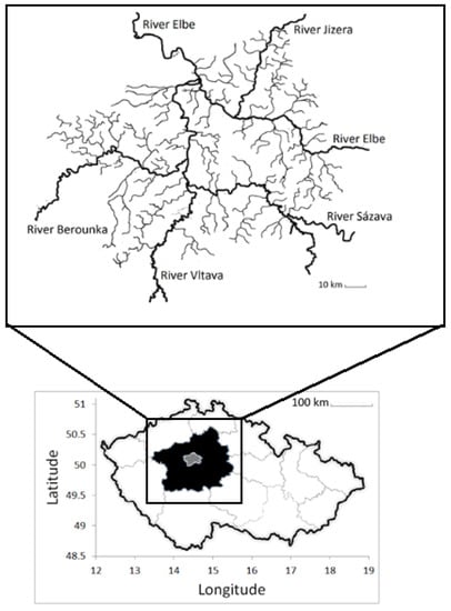 This study was carried out on lowland mesotrophic rivers that are 30–250 m wide, cover an area of 150 km2, and have a fish biomass of 150–300 kg per ha []. They are situated in the city of Prague and the agricultural region of central Bohemia (49.5–50.5° N, 13.5–15.5° E), the Czech Republic, central Europe (Figure 1). The regions cover an area of 11,500 km2, are in the temperate zone, and belong to the North Sea drainage area and the Elbe River Basin.
