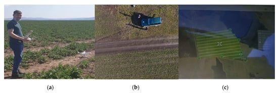 The areal monitoring of crops: (a) the DJI Phantom 4 drone; (b) image captured by the drone; (c) flight layout.