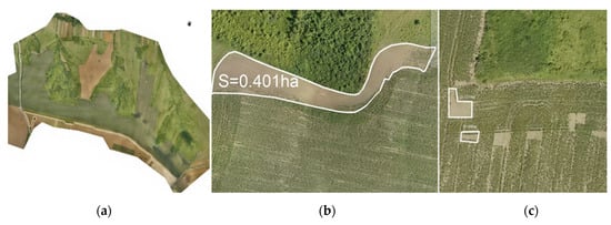 The results of flights undertaken by drone: (a) orthophoto layout; (b) surfaces affected by agrophytotechnical factors; (c) surfaces affected by excessive pasturing.