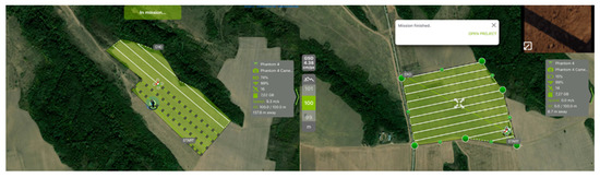 Moreover, when returning from a mission, due to a command or reaching the minimum acceptable battery power (15 percent), landing occurs automatically on the shortest route, followed by battery replacement, take-off, and the resumption of the mission by repositioning on the route established in the flight schedule. However, the drone will resume recording aerial photographs from the point of interruption (Figure 4). Figure 4 indicates that the drone traveled 954 × 700 m in 15 min, covering 66 hectares at a height of 100 m with communication with 14 satellites. Ground Sampling Distance (GSD), which is the size of a pixel at ground level, is used: in this example, 4.38 cm determines the accuracy (resolution) of the photographs.