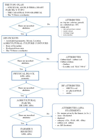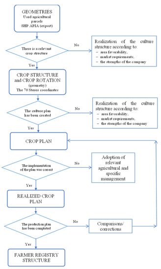 The use of drones on the farm for the aerial surveillance of agricultural crops and precision technology has resulted in better decision making by increasing the awareness of identified problems and the precise monitoring of influencing factors. As a result, two integrated logic schemes were developed: one that digitizes each agricultural plot and allows the download of forms useful for state institutions (Figure 6) and another that records and manages the inputs for each agricultural plot in order to optimize them and allows the download of forms useful for interacting with state institutions (Figure 7). This resulted in a growth in farm operations, which began with a retrospective technical-economic analysis at the plot level and considering the suggested crop structure and the promotion of crops unique to the concept of sustainable agriculture. In addition, the farm’s management uses data collected from drones and predictive analyses to gain knowledge about the enterprise’s future possibilities by suggesting feasible alternatives. The study reveals that early and precise diagnosis is critical in reducing losses caused by various stressors (diseases, pests, weeds, and so on), and drones play a vital role in gathering real-time information about the state of the crops. As a result, the intervention is quick, efficient, and successful uet o the precision technology of the farm’s equipment. Agricultural crop aerial monitoring, in combination with other precision agriculture vectors, has frequently assisted enterprise management in improving technology (i.e., the use of amendments every two years, the establishment of technological lines, and the dynamic tracking of inputs allocated to each plot and their impact on production according to logical schemes).