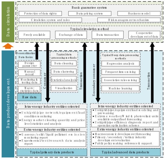 The entities in an energy big data ecosystem spontaneously carry out activities such as collection, development, and transaction that center on the energy big data that are currently available (Section 2.2). However, the operation of the ecosystem as a whole remains disorderly when viewed from a macro-perspective. Some policies and research studies have been created and conducted in relation to energy big data (Section 2.1); in particular, the Chinese government has issued a series of policies to promote the development of the energy big data industry. However, the current research on energy big data primarily focuses on technology and applications at the data level, including acquisition, analysis, integration, model development, scheme optimization, decision support, etc.