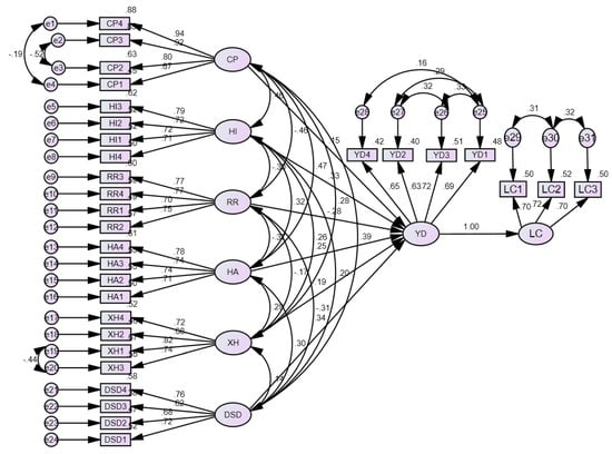 The exploratory factor analysis identified latent factors and measured observed variables for each latent factor. The exploratory factor analysis results are the premise for the next confirmatory factor analysis. Table 5 below presents the standard loadings of the confirmatory factor analysis.