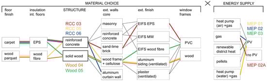 Figure 1 shows the construction and energy source variations for the sample project. We aim to cover the majority of standard construction parts and a selection of heating systems. As quantifying the tradeoff between energy standard and embedded emissions is not the primary goal of this study, we excluded the mutual influence of CG 300 and CG 400 + B6. Therefore, we kept the energy standard and the heat/cold distribution constant. For example, all variations of the building contain floor heating. As such, we can consider the variations of CG 300 and CG 400 + B6 separately. For a decision-making process, these subsystems can be optimized separately and recombined to obtain a complete solution.