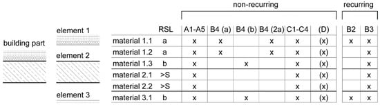 LCI matrix for a building part. RSL = reference service life, S = study period; a = number of years (RSL) smaller than S and less than S/2; b = number of years (RSL) smaller than S and greater or equal to S/2.