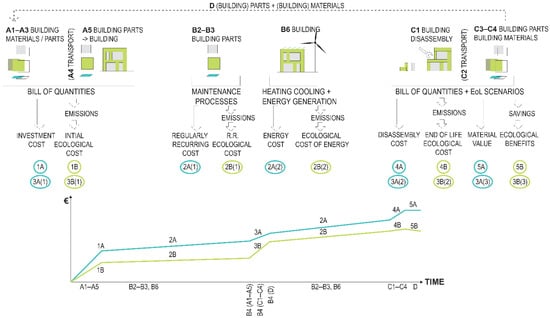 To integrate the two different life cycle approaches, LCA and LCC, it is necessary to use the same bill of quantities for the life cycle inventory and an integrated database for both environmental and economic values with the same base year. Matrices showing the data for each life cycle phase and each building element or material are at the core of the LCI, containing all necessary information for the subsequent impact assessment (Figure 2).