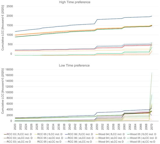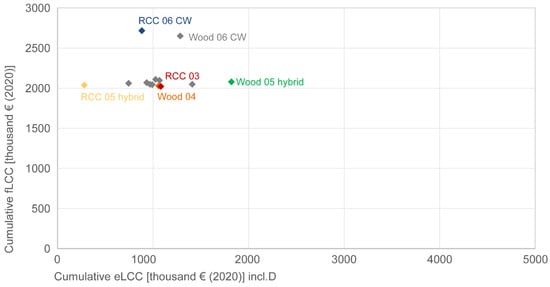 Overall, the choice of time preference scenario has a greater impact on eLCC than on fLCC, as the end-of-life phases play a more significant role in environmental than in economic considerations. Comparing all building variations in all scenarios regarding their total cost (Table A3, Table A4 and Table A5 in Appendix B), variations with a wood structure outperform those with a reinforced concrete structure only for the scenario with high TP if phase D is included. Hybrid variation RCC 05 ranks first in the standard and low-TP scenario if phase D is included; it still ranks high (rank 3 of 13) in the high-TP scenario. If phase D is excluded, the recommendation stays the same for the standard and low-TP scenario but changes for the high-TP scenario.