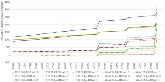 From these results, we selected five variations for representation in timelines, three of which contain a reinforced concrete structure and two of which contain a wood structure (Figure 1, Table A1). Each of these variations yields an extreme in at least one scenario: they result in give the lowest fLCC (RCC 03), highest fLCC (RCC 06), lowest eLCC (RCC 05) and highest eLCC (Wood 05). We added one solution (Wood 04) because experience with standard LCA calculations has shown that a wood structure with a ventilated façade is a recommended solution based on LCA results. Cumulated cost results for all variations can be found in Table A3 in Appendix B.