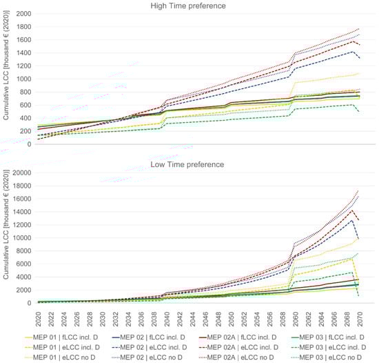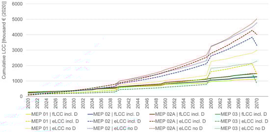 Considering that the same monetary valuation and framework as for the CG 300 investigation applies to CG 400 + B6, the most significant difference between the two building subsystems is the fact that all but one variation display higher eLCCs over their lifetime than fLCCs, even if phase D is included in the calculation (Figure 7). This is due to the high EC caused by the burning of fossil fuels which is visible by the comparatively steep slope of the timelines and is even present in the renewable heat supply solutions due to the electricity mix. Moreover, the ratio of environmental cost of parts of the MEP systems (e.g., PV cells, copper cables) to the financial cost is higher than for building materials (CG 300).