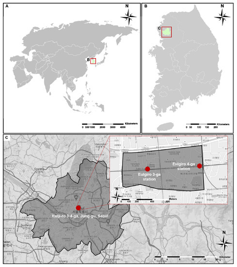Study area: geographical location of (A) The Republic of Korea, (B) Seoul Metropolitan Government within Korea, (C) location of stores and fieldwork surveys within Seoul Metropolitan Government.