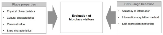 The motivation to use SNSs is often discussed in studies on SNS usage. SNS is another space for self-expression. SNS users not only share personal information on SNSs but also reveal their interests and tastes through the places they visit every day [7,22]. Kim (2016) reported that visitors who are highly motivated to express themselves are likely to have a strong desire to visit the kind of places through which they reveal their tastes [23]. Park (2020) conducted a study on the way SNS users reveal themselves and found that they tend to express themselves better on SNS [24]. Previous studies have also confirmed that SNS users tend to share photos that can be evaluated positively by others. Accordingly, it can be predicted that visitor evaluation of a hip place may depend on whether the place is a spot where they can take photos that seem desirable to others on an SNS.