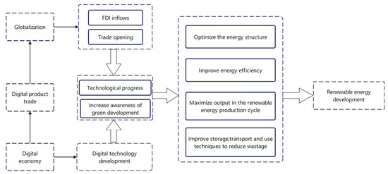 In general, it appears that some studies on globalization and renewable energy have been conducted, but they primarily analyze the impact of trade opening or foreign investment on renewable energy development [24,25,26,27,28,29,30], or the relationship between the two at the national level [18,31], with few studies examining the impact of globalization on renewable energy development from a regional perspective in a comprehensive manner. At the same time, few studies have analyzed the impact of renewable energy development in the dual context of the digital economy and globalization, whereas the research presented in this paper combines the three into a unified framework and examines the impact of the digital economy and globalization on renewable energy development. Furthermore, most current research shows that globalization has a linear impact on renewable energy development; however, this paper finds that the impact of globalization on renewable energy development is nonlinear due to the digital economy’s level of development. The related impact mechanism is shown in Figure 1.
