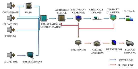 The downstream WWTP has a potentiality of 143,000 PE; besides treating three P&P lines (condensate, bleaching, process WW; a total of about 128,000 PE), it also receives a minor municipal WW contribution (about 10% of total flowrate, corresponding to 15,000 PE) from the surrounding municipalities. A simplified process scheme of the studied WWTP is shown in Figure 1. Briefly, about 20% of condensate WW flowrate is pretreated by an anaerobic UASB reactor, while the other P&P streams (including the residual 80% of condensate WW flowrate) are directly sent to the pre-aeration and neutralization tank. Municipal WW is pretreated through screening and grit removal before being mixed with the P&P WW streams in the pre-aeration tank. The pre-aeration and neutralization tank aims to correct pH (from acidic to neutral values) and dosing nutrients (nitrogen and phosphorus) that are substantially absent in the P&P effluents. A CAS unit is installed downstream for biological WW treatment, while physicochemical coagulation-flocculation is conducted as a tertiary treatment before effluent discharge. Tertiary treatment is required to reach the tight discharge limits, especially regarding COD (125 mg O2/L) and TSS (35 mg/L). For this treatment, a coagulant (decoloring agent) and a flocculant (cationic polyelectrolyte) are dosed. The sludge line treats both biological and chemical sludge produced from WW treatment and includes static thickening, aerobic digestion, and dewatering (filter press) phases.