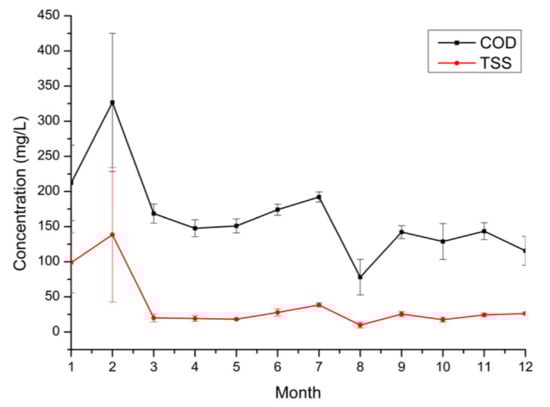 The mean characteristics of the investigated secondary effluent (outlet of the CAS unit) are summarized in Figure 2 (monthly basis). Generally, TSS concentration is significantly lower than COD’s, showing common values of 15–40 mg/L, with some undesired peaks (as observed in January and February) due to unwanted biomass losses from the CAS unit. COD concentration normally ranges between 100 and 200 mg/L, with some fluctuation observed in the winter months due to the aforementioned issues (biomass entrainment from biological CAS treatment). It should be highlighted, in addition, that the investigated P&P mill stopped production for some weeks in August and December. During those periods, municipal WW contribution to the total plant load becomes more important, decreasing secondary effluent strength.