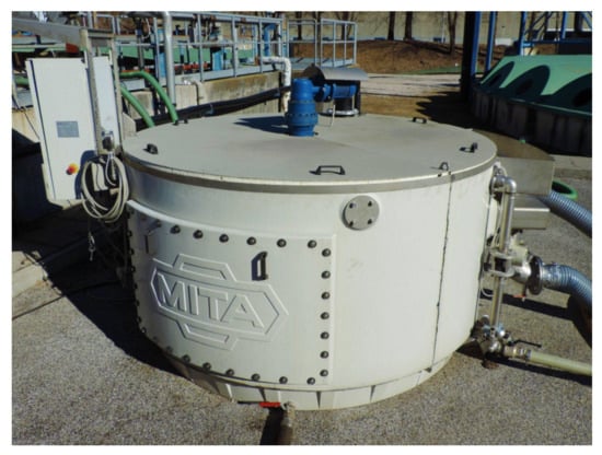 The pilot plant for cloth filtration was provided by MITA Water Technologies S.r.L.; it was designed to treat a significant amount of flowrate (50 m3/h) to provide representative results. The pilot-filtration tests were directly carried out at the studied WWTP for about 3 months (November 2021–February 2022) to consider daily variations in the treated COD and TSS load, highlighting any potential issues that may arise during continuous operations. A dedicated pipe was installed to withdraw the secondary effluent and divert the desired flowrate to the filtration unit. A photograph of the installed pilot filtration plant is shown in Figure 3, while its technical characteristics are summarized in Table 2. The hydraulic load of the pilot unit was calculated as 5 m3/m2 h (i.e., the ratio between treated flowrate and filtrating surface).