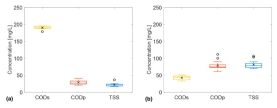 COD and TSS analyses were performed according to the Standard Methods of Examination of Water and Wastewater [34]; total COD (CODt) analysis was executed on raw samples, while soluble COD (CODs) measurement was carried out after filtering the samples at 0.45 µm. Particulate COD (CODp) was calculated as a difference between CODt and CODs. TSS analysis was performed by filtering a known effluent volume and collecting the solids on a filter having a pore diameter of 0.45 µm. Successively, the material deposited on the filter was desiccated at 105 °C in an oven, and the residual solid mass was divided by the filtered liquid volume to get the final TSS measure (expressed as mg/L). All the analyses were carried out in duplicate, and mean values are reported hereafter (Section 3).