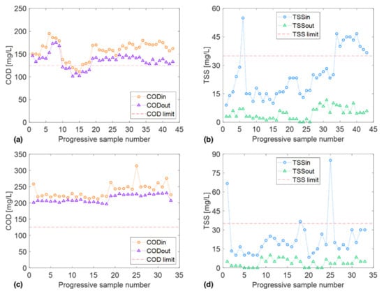 Influent and effluent COD (a,c) and TSS (b,d) concentrations measured in the pilot filtration plant for cloth 1, pore diameter of 10 µm (a,b) and for cloth 2, pore diameter of 5 µm (c,d). The COD and TSS limits for effluent discharge are depicted as well (red dashed line).
