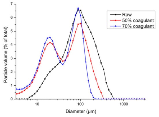 A dimensional analysis of raw secondary effluent and secondary effluent with 50% and 70% of coagulant dosage was conducted to get further insights into this negative outcome (Figure 6). It could be observed that while in the raw effluent particle fractions having a diameter of <10 µm were substantially negligible, this was not the case when the coagulant was dosed. In fact, in the latter case, a significant aggregation of small colloidal molecules into larger particles, with diameters between 1 and 10 µm, was observed (Figure 6): this particle size range could not be efficiently retained by the cloth medium contributing to the observed reduction in TSS removal.