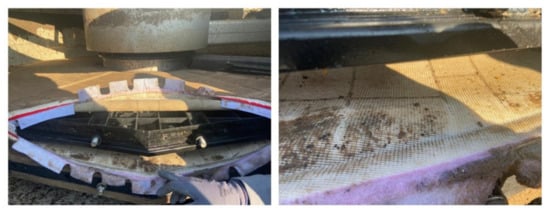 In addition to the aforementioned issues, further operating problems were observed throughout the pilot filtration campaign, especially considering cloth 2 as a filtrating medium. In fact, significant cloth fouling was highlighted after only a few weeks of operations (Figure 7), which increased downstream effluent TSS concentration and remarkably reduced TSS removal efficiency (down to 26%). Thus, an extraordinary maintenance intervention was immediately planned and performed by dosing citric acid to clean the filtration medium and restore good cloth functionality.