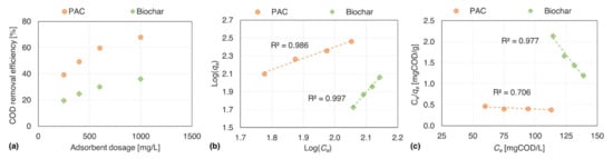Both PAC and biochar were used as adsorbent media. A significantly higher COD removal efficiency was observed when dosing PAC compared to biochar. Maximum COD abatements were respectively 68%, as regards PAC, and 32%, as regards biochar (Figure 8a). Linearized Freundlich and Langmuir isotherms are shown in Figure 8b,c, respectively. As expected, the Freundlich isotherm best fitted the experimental data compared to the Langmuir isotherm. The parameter n, related to the affinity between adsorbent and adsorbate, was higher for PAC (0.79) than for biochar (0.25). In addition, the Freundlich capacity factor (KF), representing the maximum adsorption capacity, was remarkably higher for PAC (0.716 (mg COD/g)/(mg COD/L)1/n) than for biochar (4.4 × 10−7 (mg COD/g)/(mg COD/L)1/n).