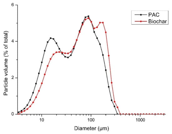 Finally, the dimensional analysis of the utilized adsorbent media (Figure 9) showed a good correspondence between PAC and biochar curves, with pronounced peaks at 100–150 µm: consequently, the diverse performances on COD removal (Figure 8a) should not be ascribed to different particle dimensions of the adsorbent materials, but rather to the diverse surface area (and pore characteristics).