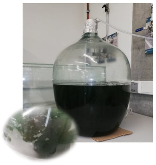 Spirulina platensis was also evaluated as a 1% dietary supplement in common carp (Cyprinus carpio L.) induced by oxidative stress and Atrazine inflammation (ATZ) [30]. In Figure 1, the cultivation and adaptation of Spirulina sp. Cyanobacteria in a 50 L bioreactor are shown, using an inoculum concentration equivalent to 20%.