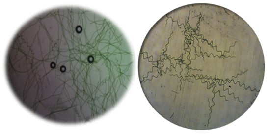 In Figure 3, it is observed that the morphology of Spirulina sp., has a spiral-shaped structure, composed of multicellular cylindrical trichomes, which are arranged in the form of an open helix, along its length, where environmental factors, such as temperature and physical and chemical conditions, affect the helix geometry [31,36].