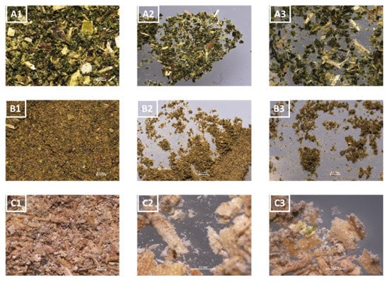 Analysis of the flour samples analyzed with the stereomicroscope. (A1–A3) correspond to cassava leaf flour; (B1–B3) to gliricidia leaf flour; and (C1–C3) to rice husk flour.