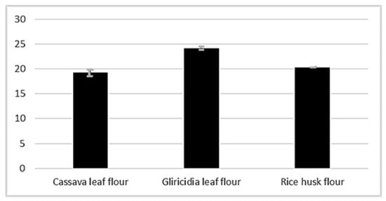 Figure 5(A2,A3) (cassava leaf flour), Figure 5(B2,B3) (gliricidia leaf flour) and Figure 5(C2,C3) (rice husk flour) show agglomerations between the particles below 500 µm, while around the particles above 500 µm small particles are observed adhering. The above effect can be associated with the drying process of the raw materials, the electrostatic effects, and van der Waals forces. Agglomeration characteristics are widely desired for extruded food processes in both human and animal feed [49]. An important application of the agglomeration process is in the production of instant products in which the primary particles are agglomerated to give a product in the form of a granule. In the production of fish feed, agglomeration improves the characteristics of the extrudate in terms of its wettability, dispersibility, and dissolution [50]. Figure 6 shows the cohesion index of the raw materials.