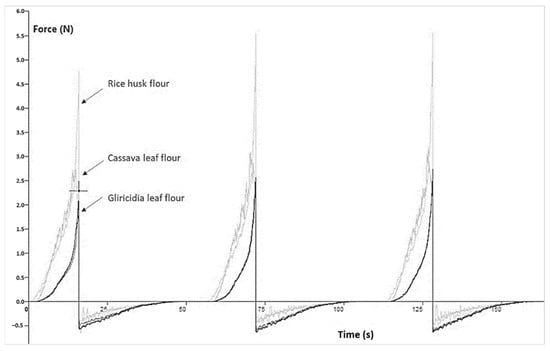 The Cohesion Index (CI) was determined using a 48 mm diameter and 10 mm high rotary blade [23,24] while the flow characteristics of the flours were evaluated using a TA texturometer. X T PLUS Texture Analyzer (Stable Micro Systems, Medellín, CO, USA) [23].