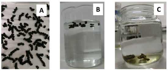 For the floating test 10 pellets were taken and deposited in a beaker with 400 mL of water at 25 °C, every 5 min the pellets that were kept on the surface were counted and the percentage of floating was determined by the method proposed by Arroyo [26].