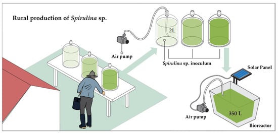 Schema for sustainable production of Spirulina sp. in rural areas. Inoculum preparation and pilot production in 350 L bioreactor.