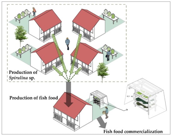 After generating the infrastructure conditions and the appropriation of knowledge to produce Spirulina sp., a model of community production of fish food is proposed. Under this model, each farmer produces Spirulina sp. on his farm, stores and transports it to a collection center where the fish feed production process is carried out by processing the agro-industrial residues of cassava leaf flours, gliricidia leaves, and rice husk, which are present in the region.