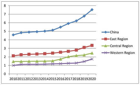 The total carbon emissions in the east are higher than those in the central and western regions. This is mainly related to the economic aggregate of the region. The larger the economic aggregate, the greater the total carbon emissions. The increase in the eastern region has been greater than that of the central and western regions. In the west, this is related to logistics industry development in the region. From the perspective of China as a whole, the total carbon emissions of the logistics industry have been tending to increase, which further shows that China’s economy has had a long-term growth trend, which is consistent with the evolutionary trend of the level of economic development.