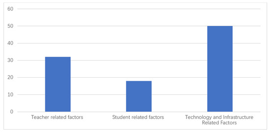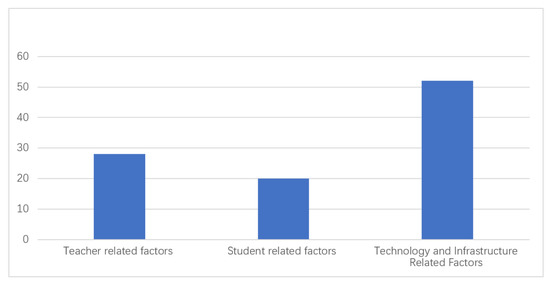 For the second query of the study, it was evident that there are factors affecting the proper implementation of online learning. The biggest problem which prevented the implementation of e-learning were the technology- and infrastructure-related problems, which were the biggest delineating factors, followed by students and teachers’ factors. This finding can be interpreted as indicating that the availability of technical devices and the strong infrastructure for applying e-learning in the Saudi Arabia are still insufficient. Further, similar findings have been reported by researchers, indicating that teachers are faced with problems and dilemmas in dealing with online learning due to student-related, teacher-related and technology-related factors. According to Gyampoh et al. (2020) [44], the mindset, technical knowledge, time limitations, pedagogy and professional concerns were all core elements of distance learning. In addition, there were also problems with the levels of web-based training readiness and satisfaction among teachers. Most answers were considered strong in terms of preparation, temperature, and ability to lecture online on course design, connectivity, time control and technical issues (Kaden, 2020; Van Nuland et al., 2020; Wu et al., 2020) [45,46,47].
