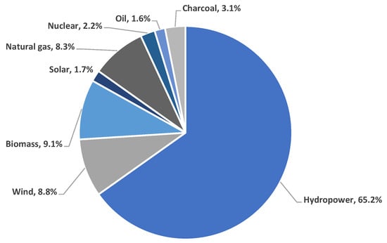 Out of 1.98 million new light vehicles registered in 2021 (79% passenger cars and 21% light commercial vehicles), 84% were fitted with flex fuel engines, 3% with gasoline engines, and 13% were diesel-powered [5]. Only 2,851 electric cars were sold in 2021, just 0.14% of light vehicle sales [7]. In 2020, 85% of electric power in Brazil was generated from renewable sources (Figure 1), led by hydropower 63.8%, followed by wind generation 9.2%, biomass 9.0%, and solar energy 1.7% [8].