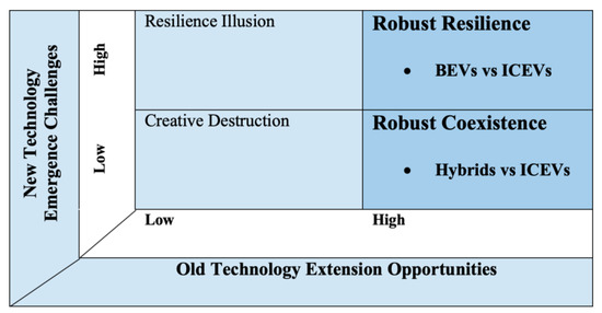 When a new technology faces significant entry barriers and the incumbent technology still has room for significant improvement, substitution tends to be slow, with robust resilience. Battery electric vehicles in emerging countries are such a case. There are considerable barriers for the dissemination of battery vehicles, and internal combustion engine vehicles can still be improved. However, if the new technology surmounts its difficulties quickly but the incumbent also improves vigorously, replacement is gradual, in a period of robust coexistence. The relation between pure internal combustion engine vehicles and hybrid vehicles is akin to that situation. The need to create a new ecosystem for battery vehicles can generate considerable tension and resistance. Hybrids may bridge the gap using existing manufacturing and fuel infrastructure (Figure 2).