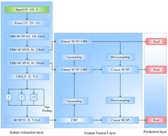 The YOLOv5 algorithm consists of three parts: feature extraction layer, feature fusion layer, and prediction layer, as shown in Figure 1.