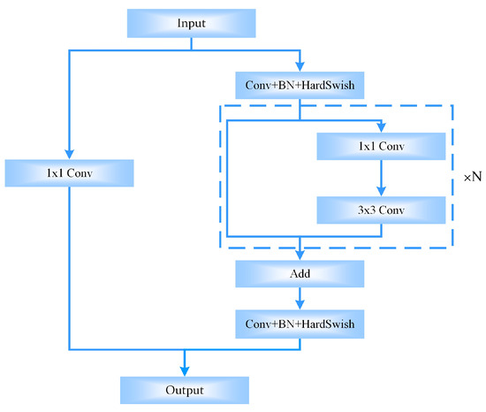 Compared with the LeakReLU of YOLOv3 and the Mish function of YOLOv4, Hard-Swish is numerically stable and computationally fast [44]. BCSP is the core structure of Bottleneck-CSPNet, as shown in Figure 2. The input features are divided into two branches on the left and right: the left side is a residual edge that maximizes the retention of the original information; the right main part carries out the residual stacking under the bottleneck structure, which can reduce the computation and also facilitate the model depth in deepening while its training process can converge better.