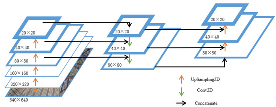 The feature fusion network is shown in Figure 3, and its network is PANet (Path Aggregation-Network) [45]. The input image is first convolved and downsampled several times to get three scales (80, 40, 20) of features, and the features are subjected to bottom-up and top-down convolution and feature fusion processes to get three new outputs. The output features are continuously fused and stacked to improve the detection capability of targets at different scales.