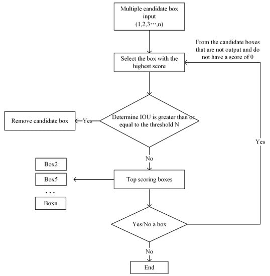 In NMS, when the IoU value of the remaining detection frame and the maximum score detection frame are greater than the set threshold, their scores are forced to zero, which easily causes the real target to be undetected when it appears in the overlapping region. For this reason, the NMS algorithm of YOLOv5 is improved by using a flexible detection frame algorithm, Soft-NMS. Using the score and overlap information of the original candidate frames with lower scores, the new candidate frame scores are obtained by a weighted form of downscaling so that the two adjacent detection frames remain in the sequence of target detection instead of being directly set to 0 and then rejected, and the higher the overlap area of the candidate frames, the lower the score, while the score of frames with very small overlap is not affected too much. The score is calculated as in Equation (8). The formula for the Gaussian function f(x) is Equation (9), its flow chart is shown in Figure 9.