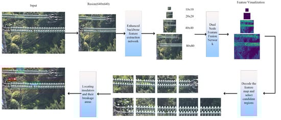 In summary, the overall structure of the improved YOLOv5 algorithm is shown in Figure 10, and the algorithm flow is shown in Figure 11. In the improved network, the input image is first cropped to 640x640 size without distortion, and then fed into the enhanced backbone feature extraction network to output four feature layers with sizes of 80, 40, 20, and 10, respectively, followed by feeding the four features into the dual-scale feature fusion network to better fuse the multi-scale features and improve the detection of large and small targets. Finally, the decoding of the original image and the feature map is used to locate the insulator and its broken area.